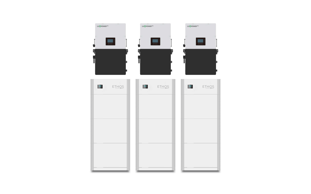 But that’s not all. We pair this ETHOS system with 3 cutting-edge 12000W Lux inverters, which feature their own LCD touch screen displays, 3 MPPT inputs each, integrated UPS modules for seamless on and off-grid switching, and the ability to handle PV arrays of up to 54000W. Plus, through their smart load control, AC coupling abilities, and peak shaving functions, you can meet your power needs and protect your business against unstable grids or rolling blackouts, while seeing huge savings each month on your electric bill.