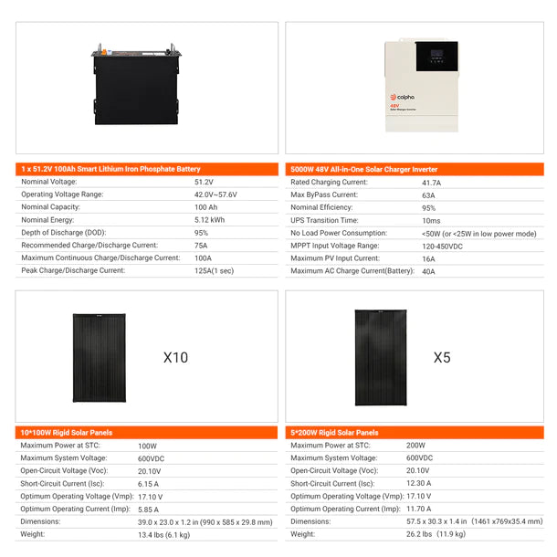 - Model: 1kW PV Rigid Panels (10*100W/5*200W)+5kW Inverter + 1*5.12kWh Battery