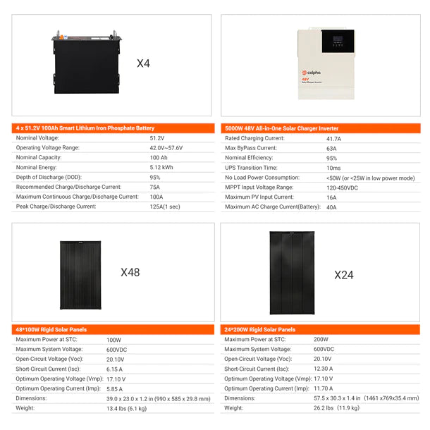 - Model: 4.8kW PV Rigid Panels (24*2*100W/24*200W)+5kW Inverter + 8*5.12kWh Batteries
