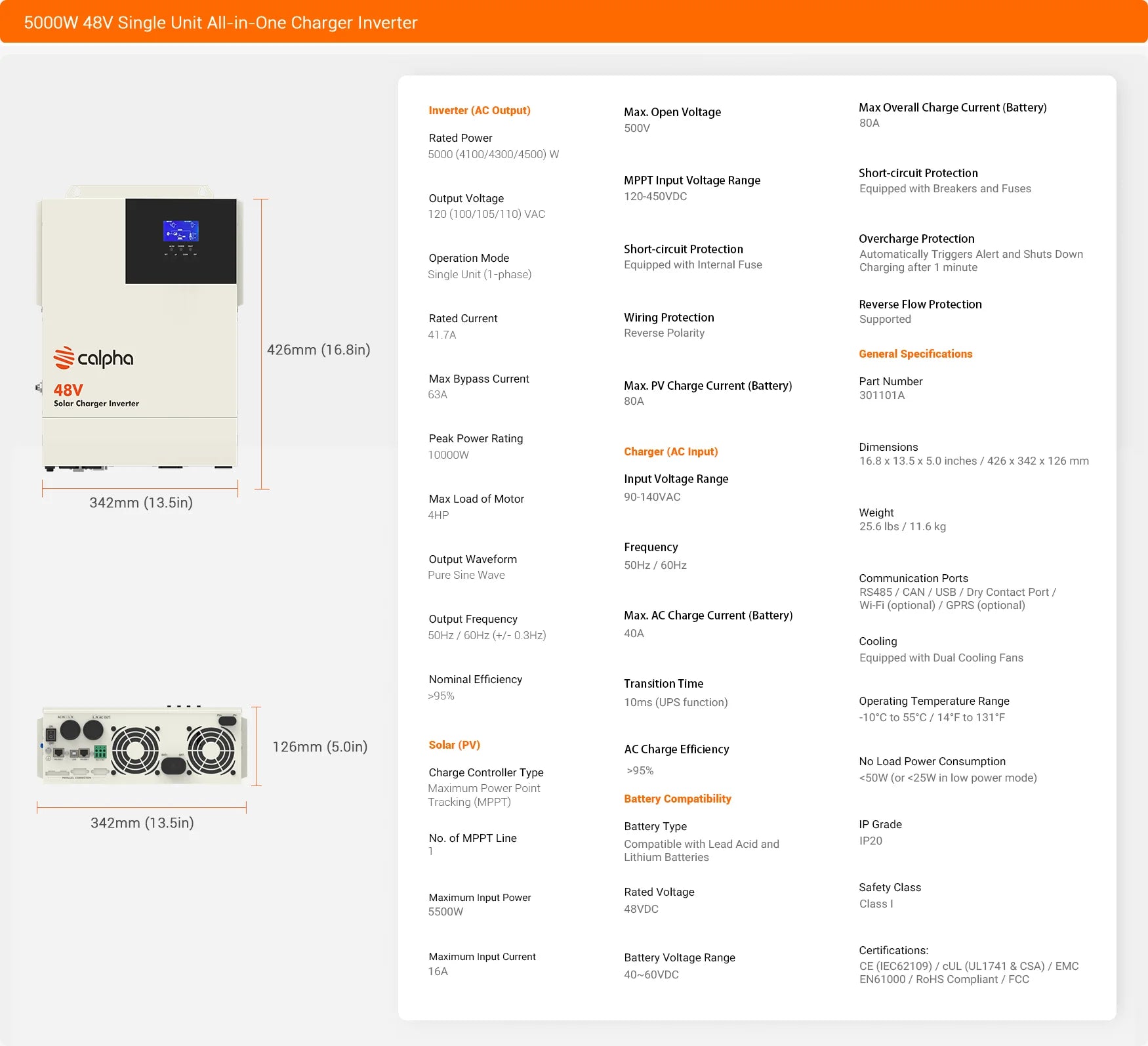 - AC Input: 5kW AC Input/Output at 120V 60Hz (Surge 10kW for Output)